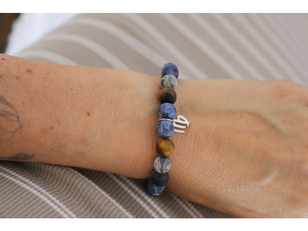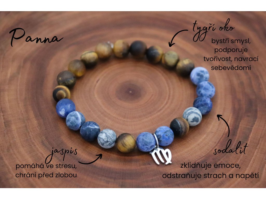 Náramek je z tygřího oka, jaspisu, sodalitu a korálku se symbolem Panny z chirurgické oceli.