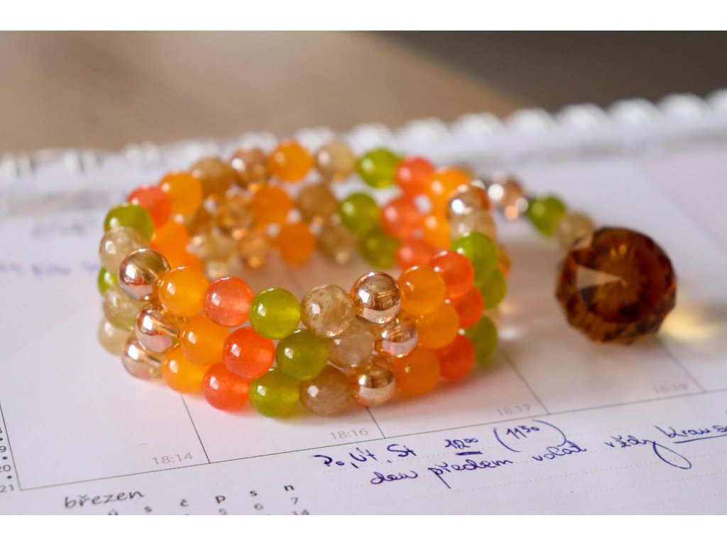 Náramek je z citrínu, křišťálu aura, chalcedonu a jadeitu.