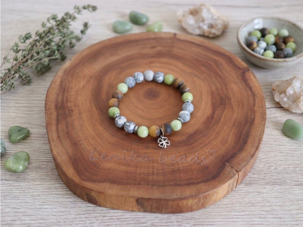 Náramek je z tygřího oka, jaspisu, jadeitu a přívěsku z chirurgické oceli.