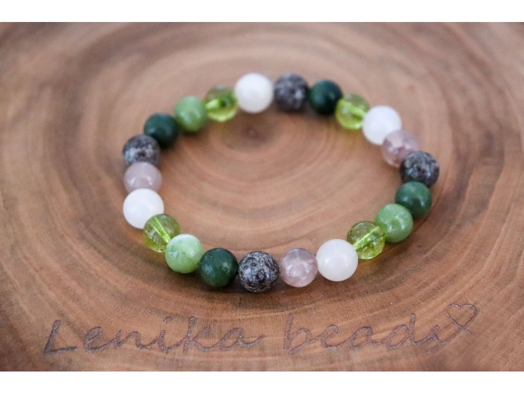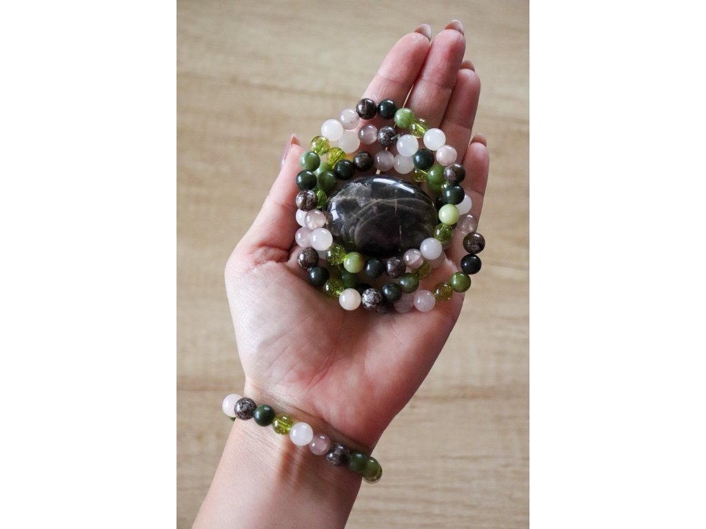 Náramek je z obsidiánu, jadeitu, avanturínu a olivínu.