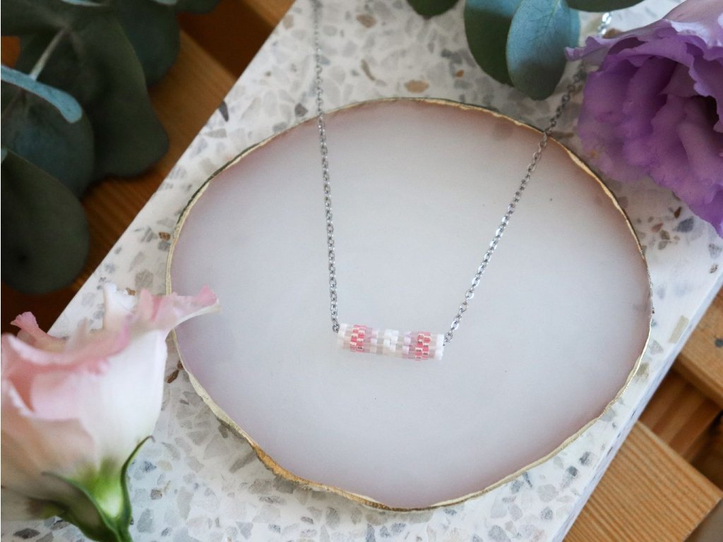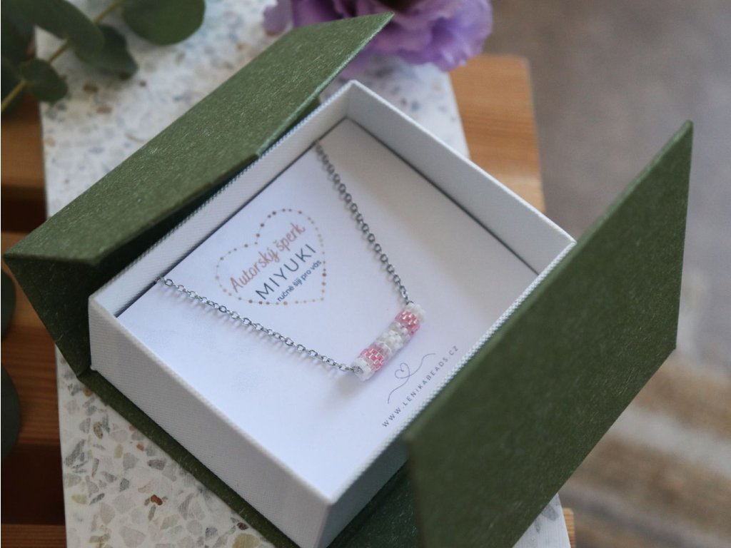 Řetízek je z nerez oceli a váleček z vysoce kvalitních japonských korálků miyuki, který je vyrobený ručně a speciálně pro vás.