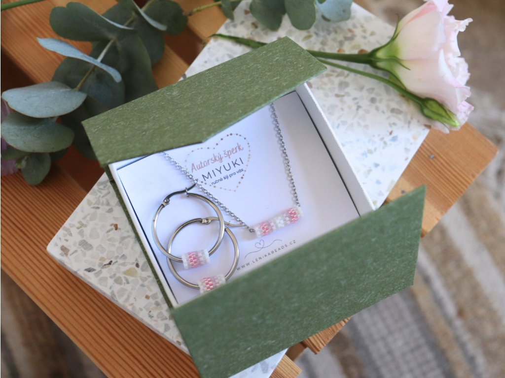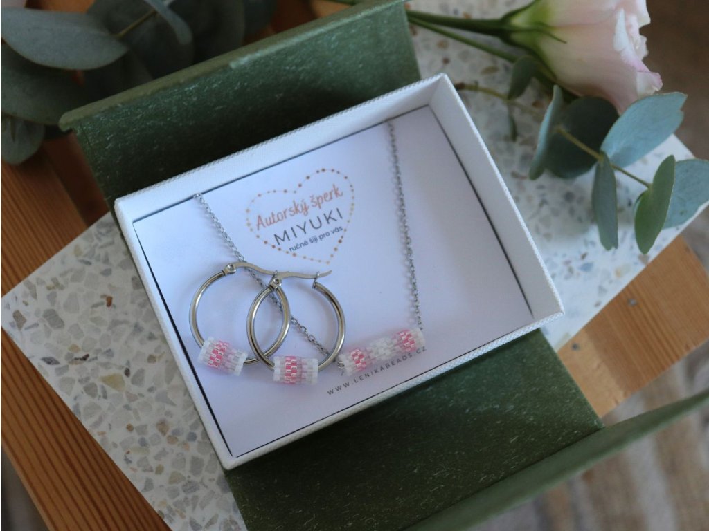 Vyroben z nerezové oceli, známé svou odolností a dlouhou životností, tento řetízek i náušnice jsou nádherným přírůstkem do vaší šperkovnice. Válečky z japonských korálků Miyuki dodávají okouzlující eleganci, kterou nelze přehlédnout. Každý korálek je ručně vybrán a pečlivě seřazen, aby vytvořil jedinečný vzhled, který vás nepochybně odliší od ostatních.